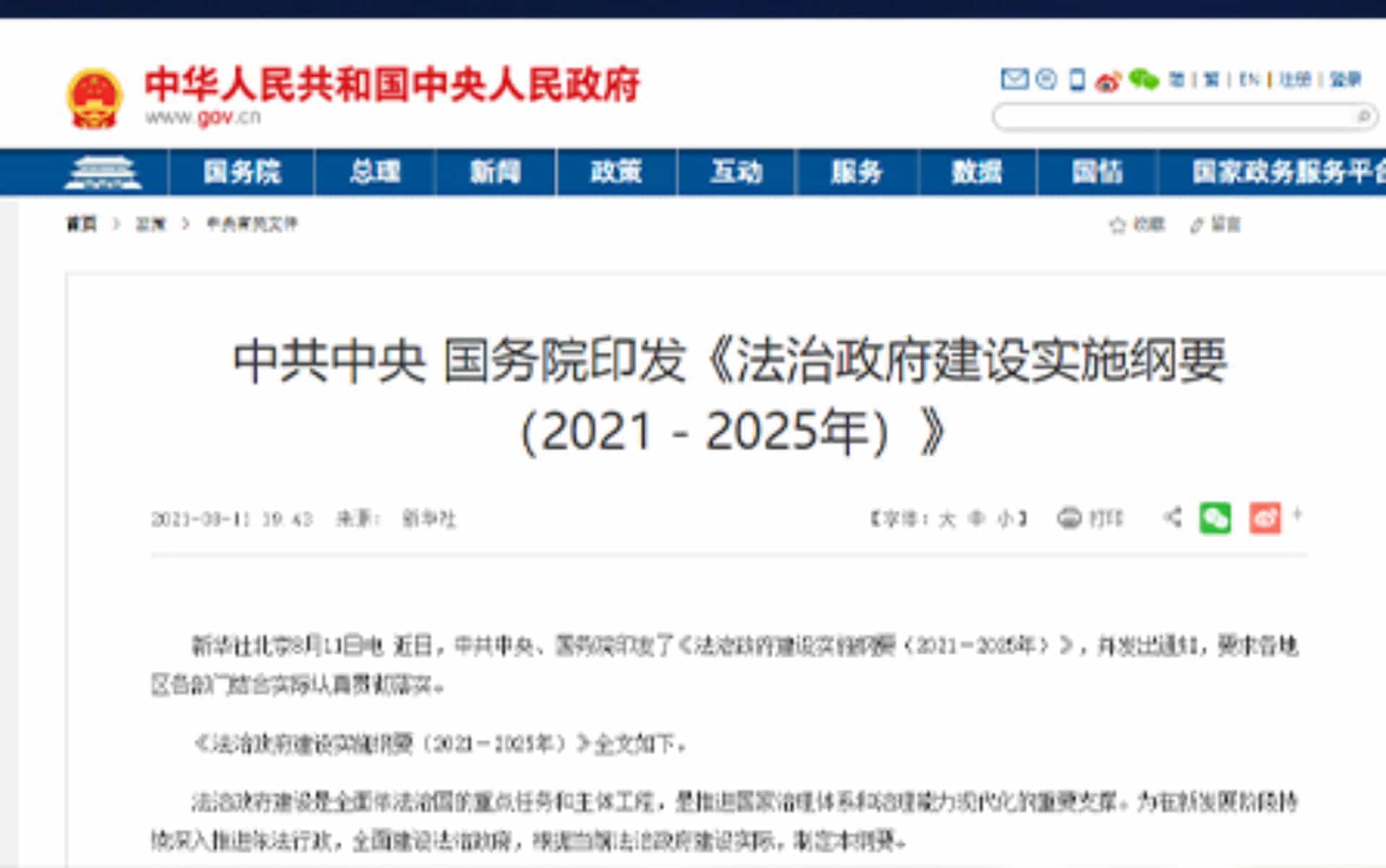 近日,中共中央、國務(wù)院印發(fā)了《法治政府建設(shè)實施綱要(2021-2025年)》,并發(fā)出通知,要求各地區(qū)各部門結(jié)合實際認真貫...